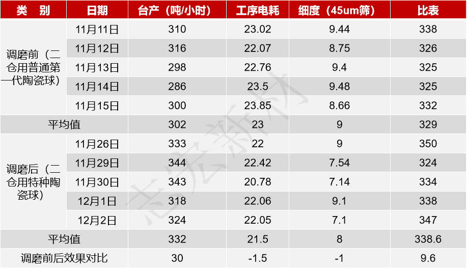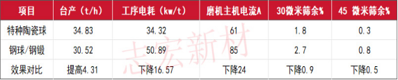 貴州紅獅水泥某企業(yè)4.6×14.5米磨機(jī)二倉原用普通第一代陶瓷球,改用第三代特種陶瓷球后,臺(tái)產(chǎn)提高30.3t/h,增產(chǎn)幅度10%;粉磨工序電耗降低1.5度/噸,下降幅度6.5%;入庫水泥45μm篩余細(xì)度降低1.0,比表面積提高9.6。