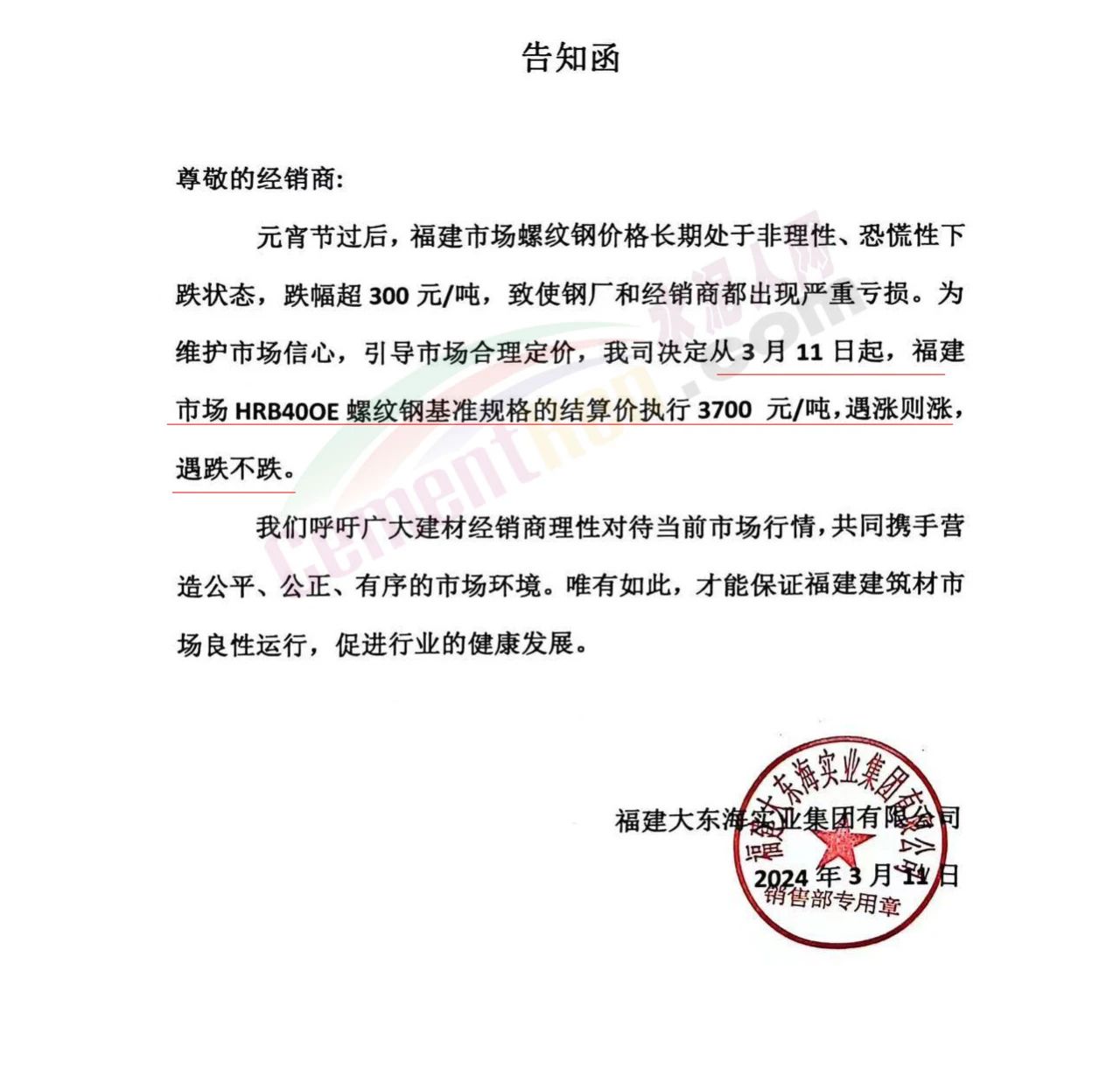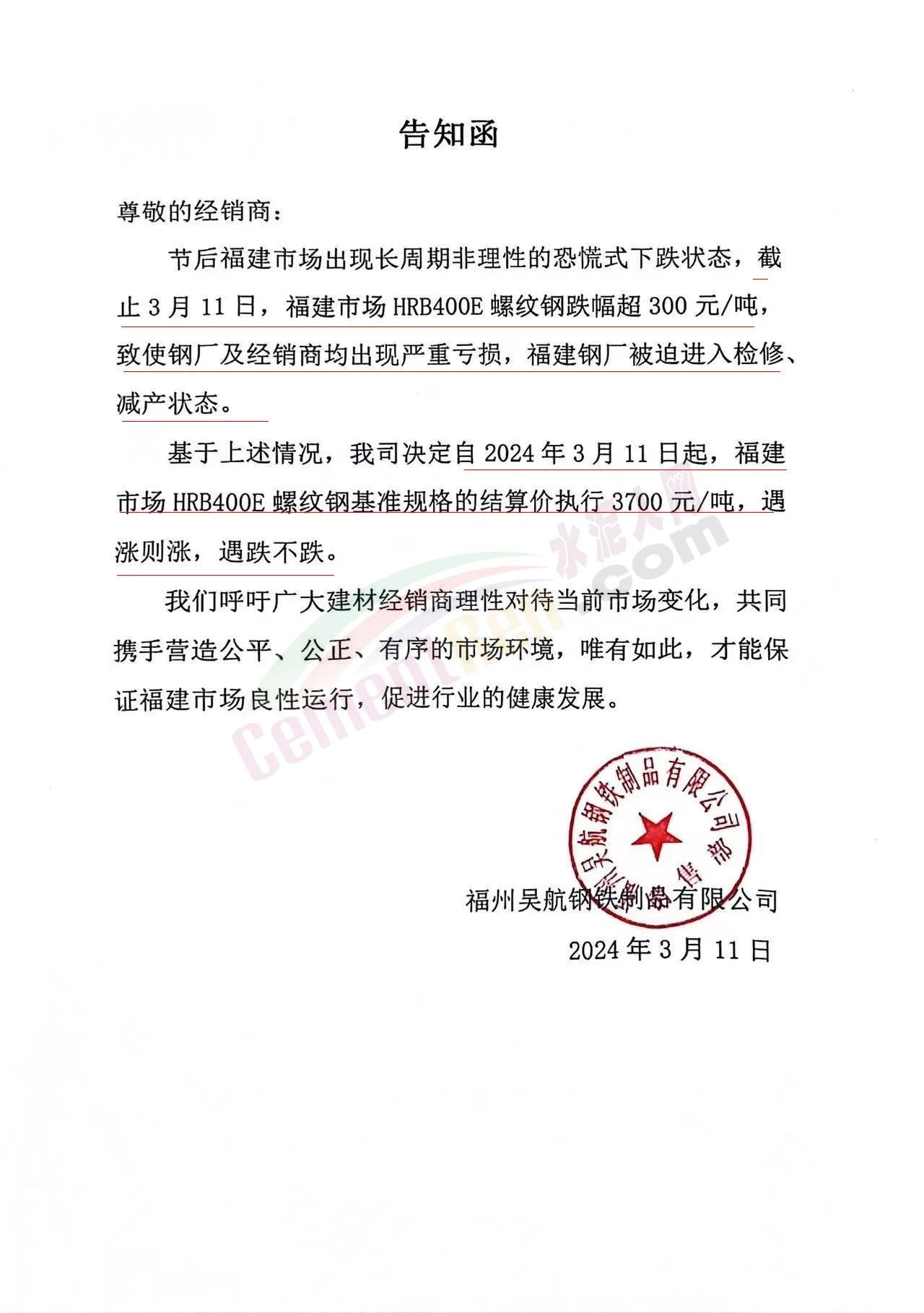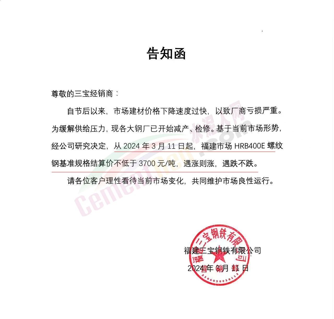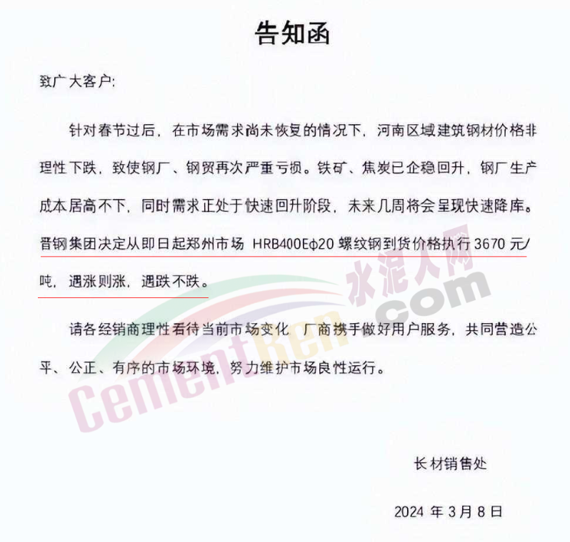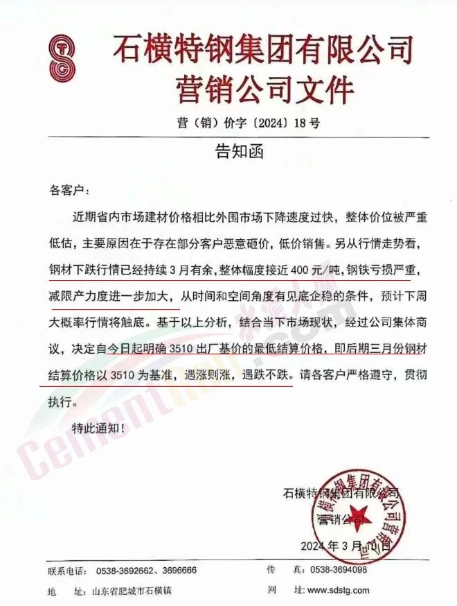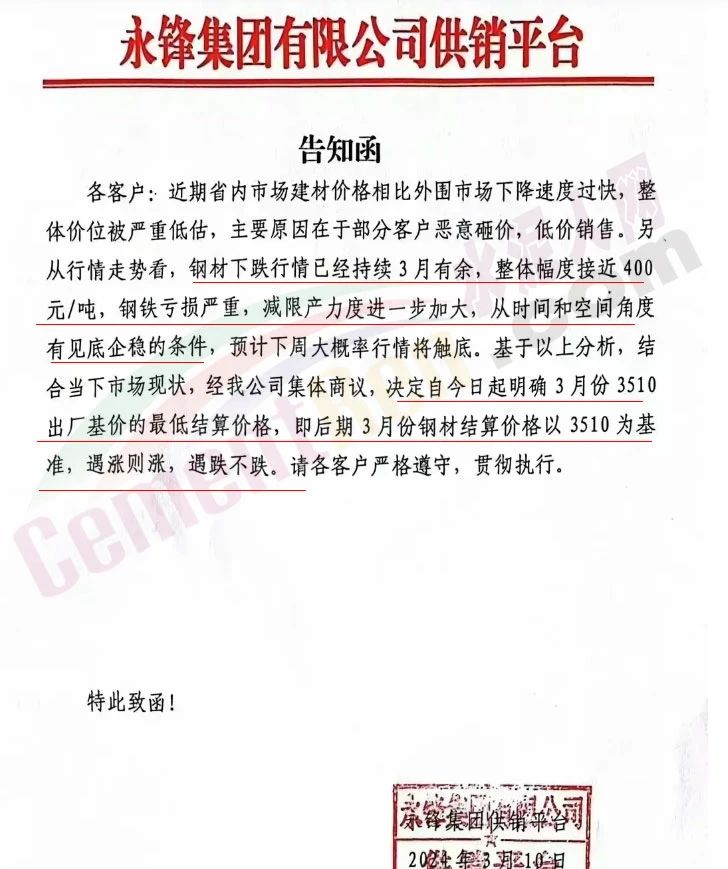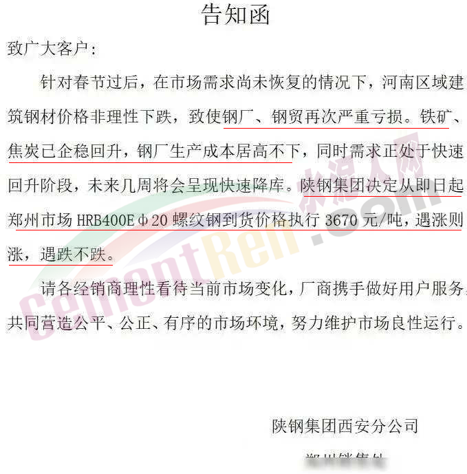 水泥人網(wǎng)通訊員消息:春節(jié)長假剛剛結(jié)束,建筑鋼材的價(jià)格就開始狂跌。有些鋼廠看不下去了,開始發(fā)限價(jià)通知價(jià)格跟漲不跟跌。