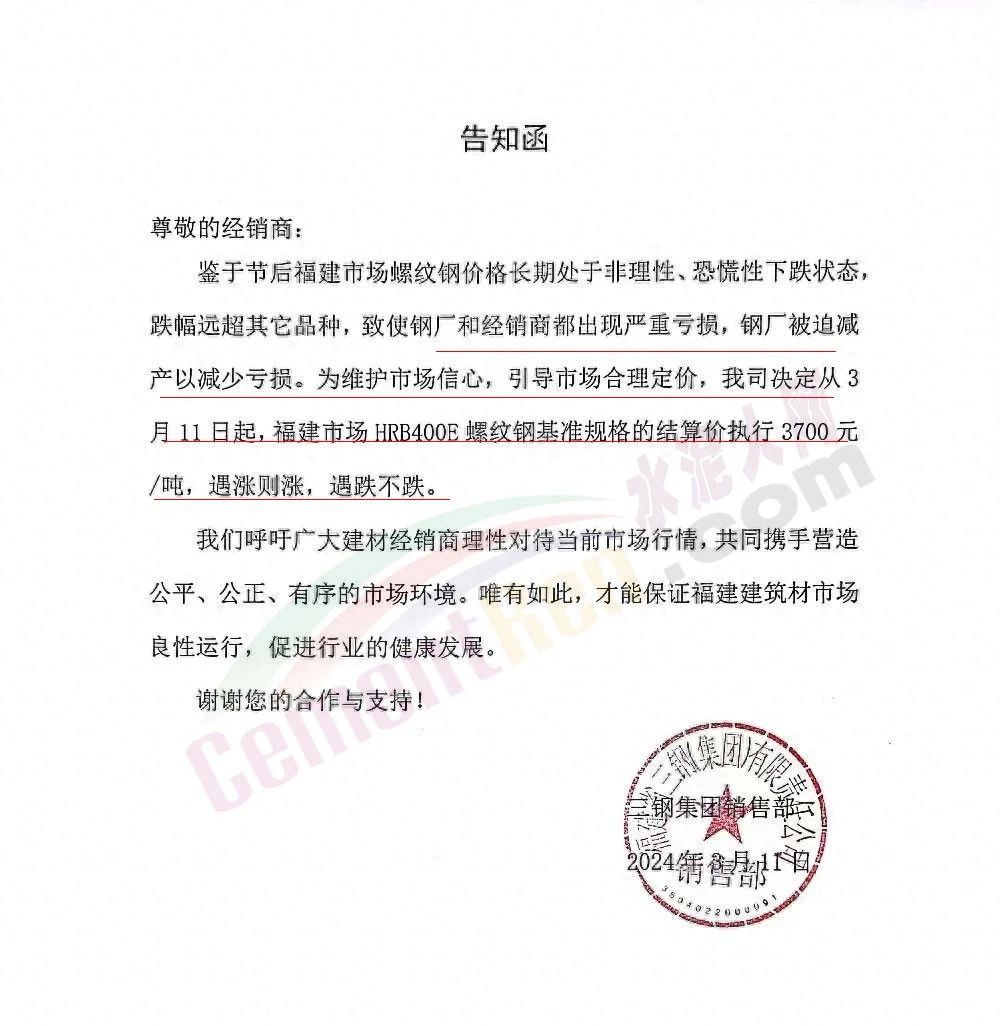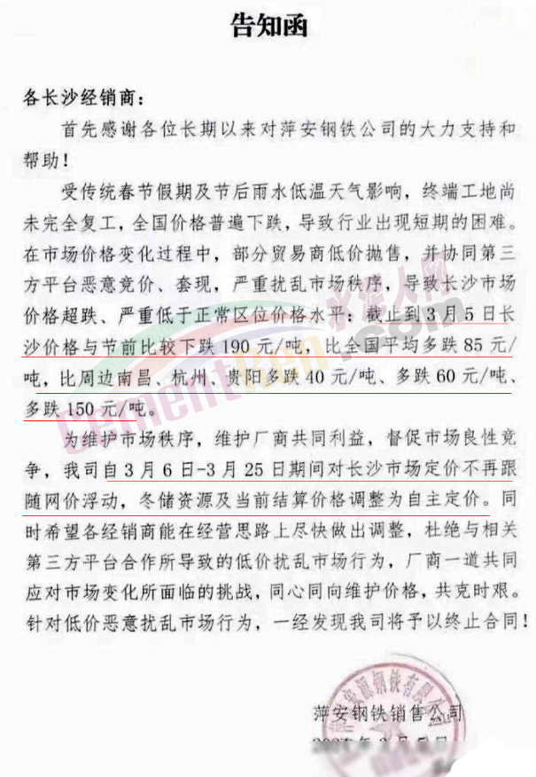 福建區(qū)域鋼鐵企業(yè)通知,鑒于節(jié)后福建市場螺紋鋼價(jià)格長期處于非理性、恐慌性下跌狀態(tài),跌幅遠(yuǎn)超其它品種,致使鋼廠和經(jīng)銷商都出現(xiàn)嚴(yán)重虧損,鋼廠被迫減產(chǎn)以減少虧損。為維護(hù)市場信心,引導(dǎo)市場合理定價(jià)。福建鋼廠集體限價(jià),遇漲則漲,遇跌不跌。