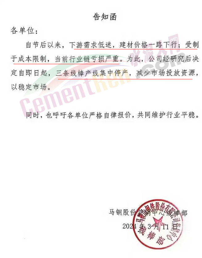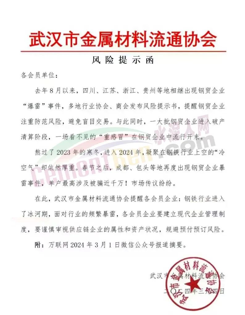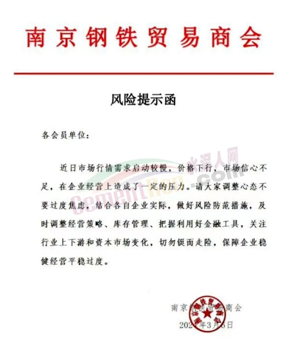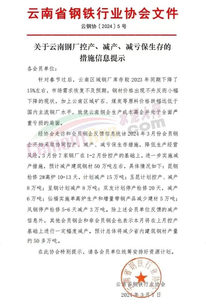 武漢市金屬材料流通協(xié)會(huì)發(fā)布《風(fēng)險(xiǎn)提示函》提到,鋼鐵行業(yè)進(jìn)入了冰河期;云南省鋼鐵協(xié)會(huì)發(fā)布《關(guān)于云南鋼廠控產(chǎn)、減產(chǎn)、減虧保生存的措施信息提示》稱,2024年3月份鋼企開始采取協(xié)同控產(chǎn)、減產(chǎn)、減虧保生存措施,降低生產(chǎn)經(jīng)營風(fēng)險(xiǎn)。3月份7家鋼廠在1-2月份控產(chǎn)的基礎(chǔ)上,進(jìn)一步實(shí)施減產(chǎn)措施,預(yù)計(jì)減產(chǎn)建筑鋼材50萬噸左右;南京鋼鐵貿(mào)易商會(huì)發(fā)《風(fēng)險(xiǎn)提示函》,提示會(huì)員企業(yè)要及時(shí)調(diào)整經(jīng)營策略。