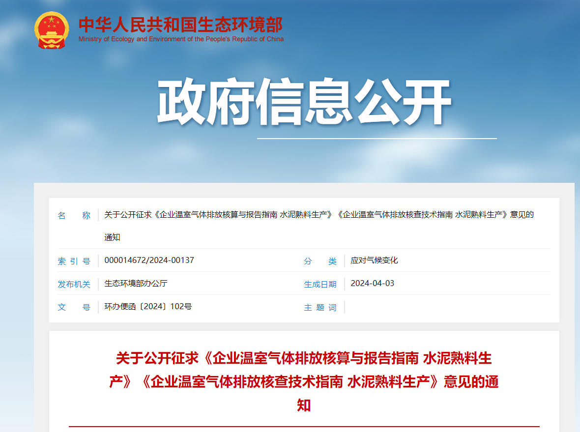 為加強企業(yè)溫室氣體排放管理,規(guī)范水泥行業(yè)企業(yè)溫室氣體排放核算報告與核查工作,做好擴大全國碳排放權交易市場行業(yè)覆蓋范圍的制度體系建設,根據(jù)《碳排放權交易管理暫行條例》,生態(tài)環(huán)境部組織編制了《企業(yè)溫室氣體排放核算與報告指南 水泥熟料生產》《企業(yè)溫室氣體排放核查技術指南 水泥熟料生產》,現(xiàn)公開征求意見(征求意見稿及其編制說明等材料可登錄我部網站http://www.mee.gov.cn/ “意見征集”欄目檢索查閱)。