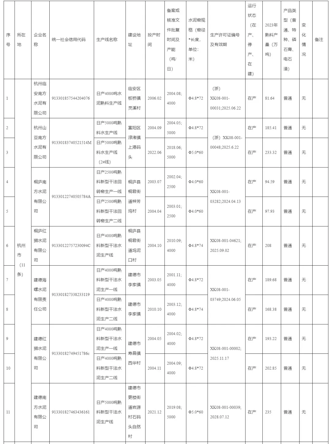 浙江省2023年度水泥熟料生產(chǎn)線清單