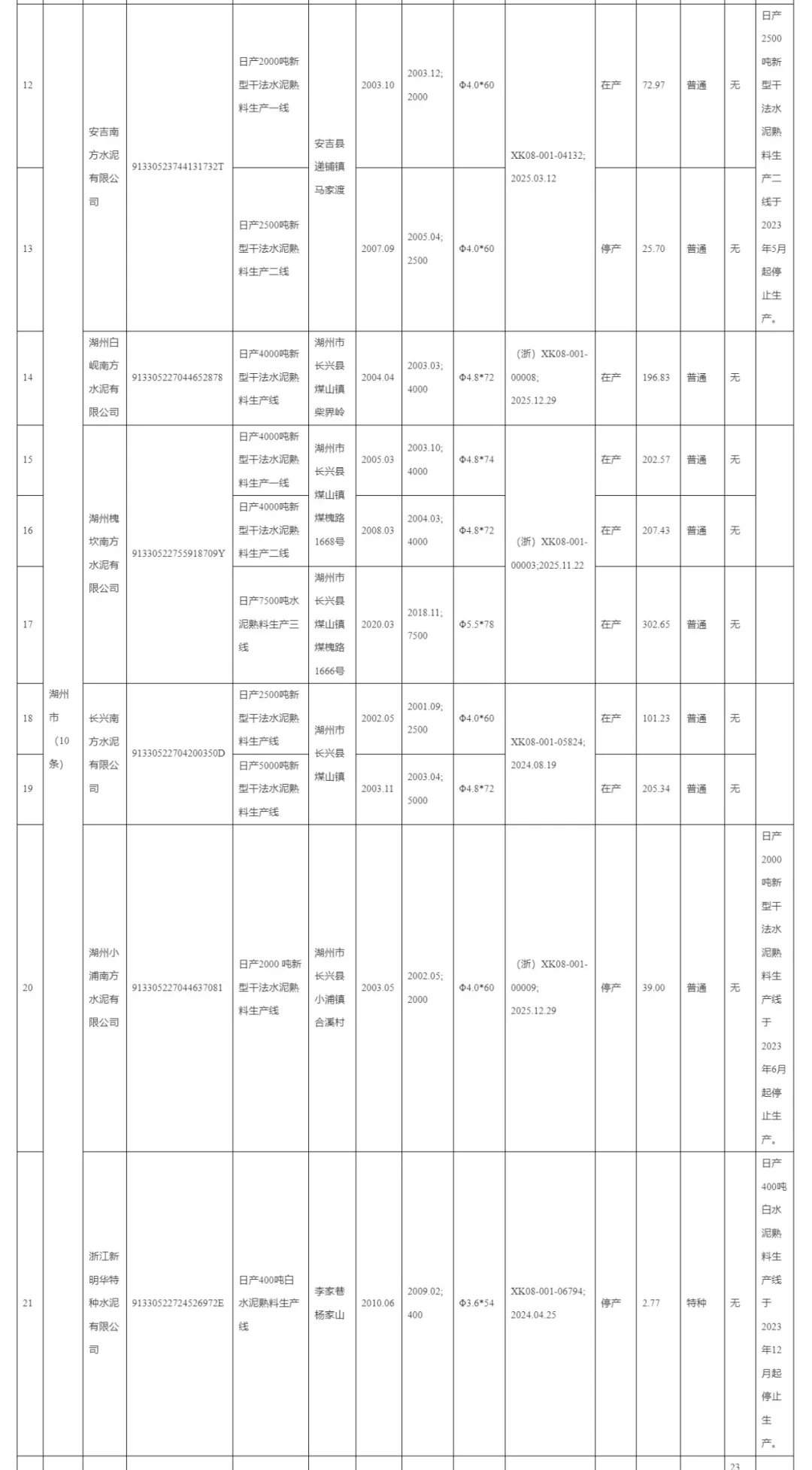 2 湖州小浦南方水泥有限公司日產(chǎn)2000噸新型干法水泥熟料生產(chǎn)線于2023年6月起停止生產(chǎn);
