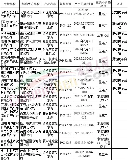 據(jù)發(fā)解,市場監(jiān)管總局此前通報的《2023年水泥產(chǎn)品質(zhì)量國家監(jiān)督抽查情況通報》中共列出16批次不合格水泥名單。其中9批次復(fù)檢仍不合格。不合格產(chǎn)品中氯離子項目不合格產(chǎn)品12批次,水溶性鉻項目不合格4批次。