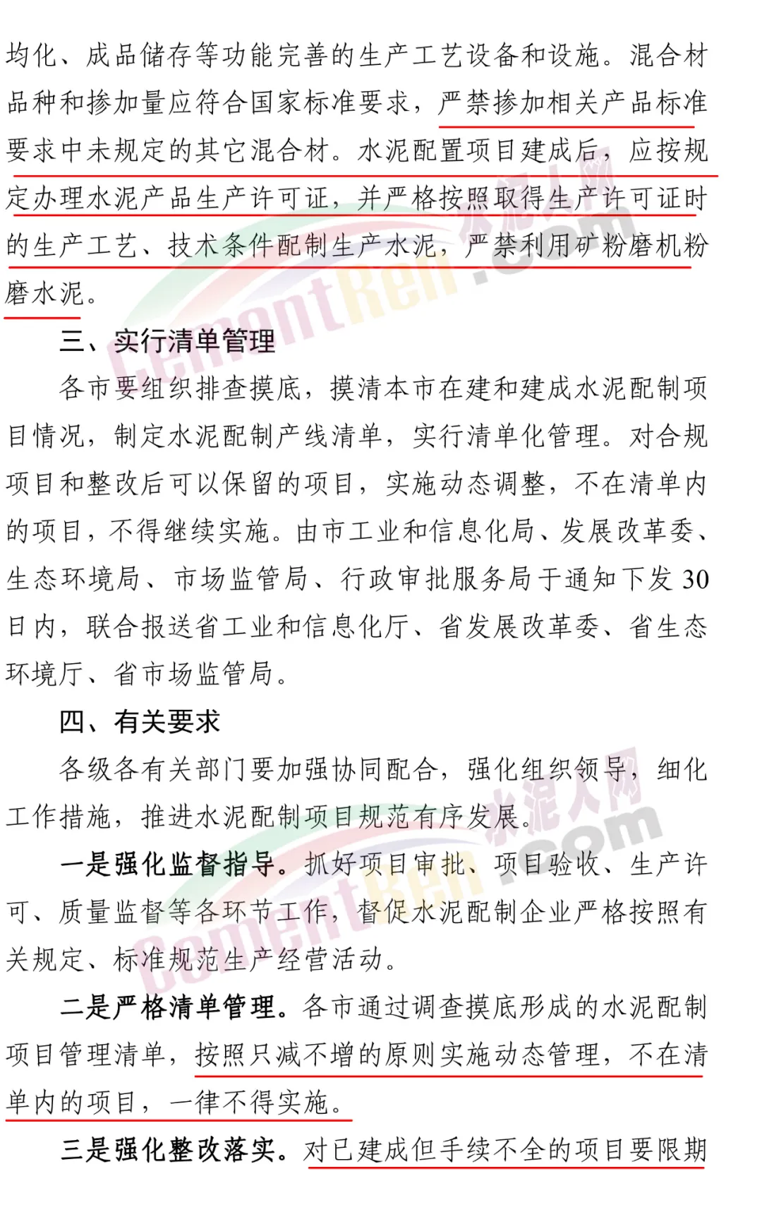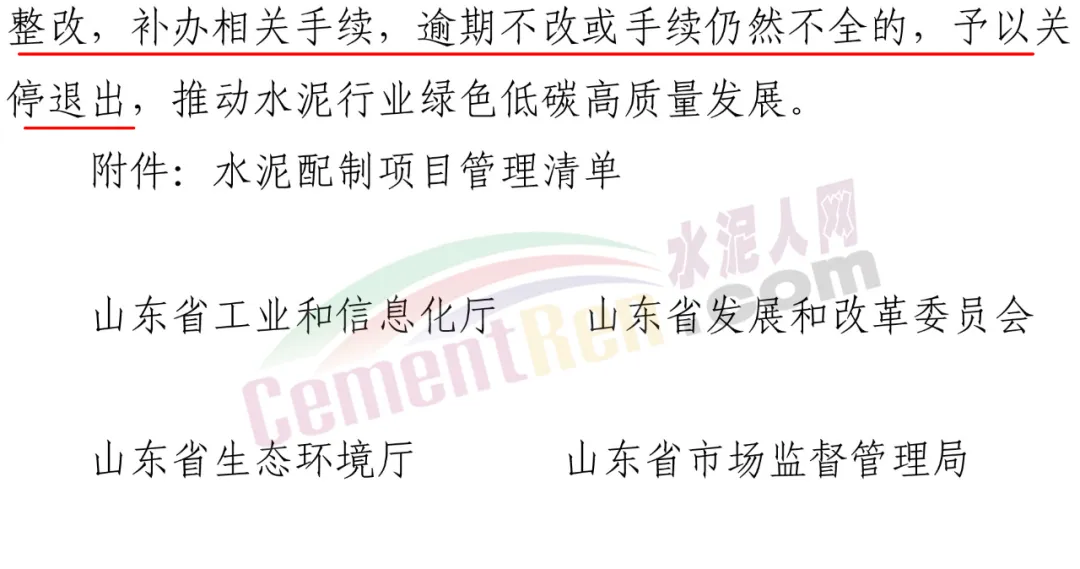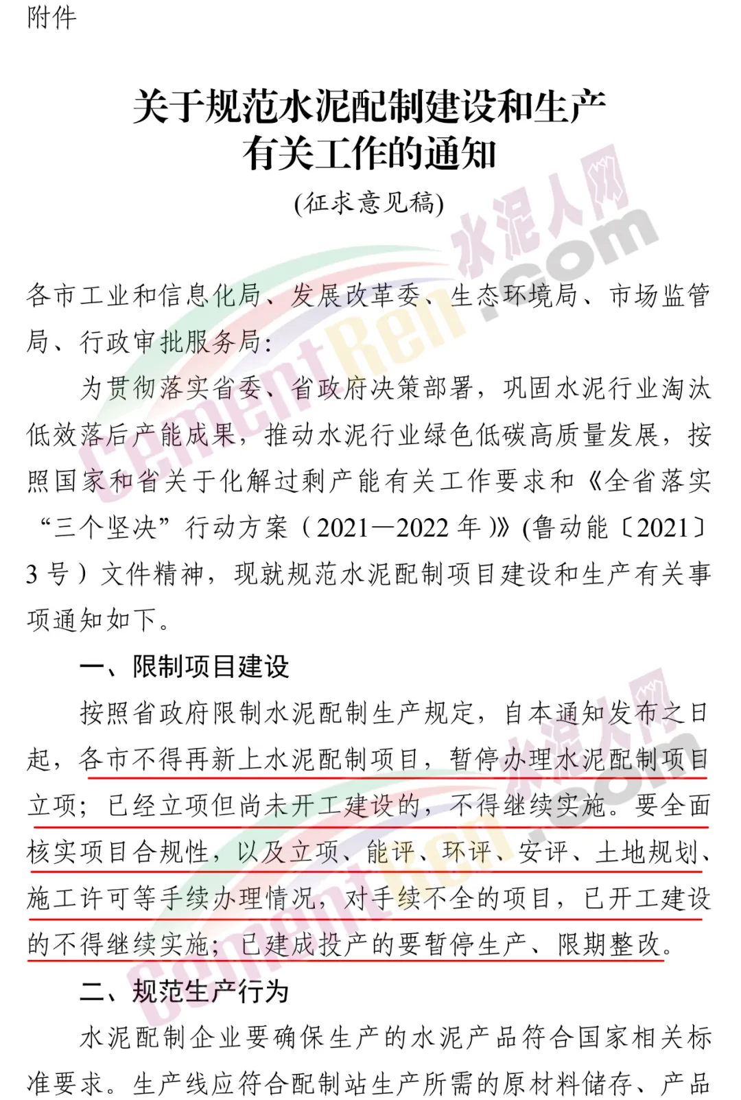 就此問題,通知指出,按照省政府限制水泥配制生產(chǎn)規(guī)定,自本通知發(fā)布之日起,山東省內(nèi)各市不得再新上水泥配制項目,暫停辦理水泥配制項目立項;已經(jīng)立項但尚未開工建設(shè)的,不得繼續(xù)實施。要全面核實項目合規(guī)性,以及立項、能評、環(huán)評、安評、土地規(guī)劃、施工許可等手續(xù)辦理情況,對手續(xù)不全的項目,已開工建設(shè)的不得繼續(xù)實施;已建成投產(chǎn)的要暫停生產(chǎn)、限期整改。