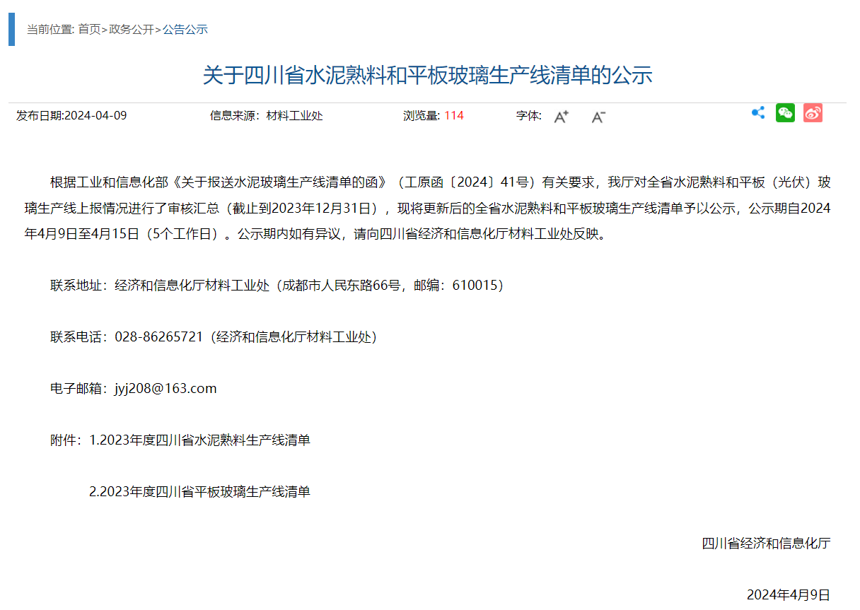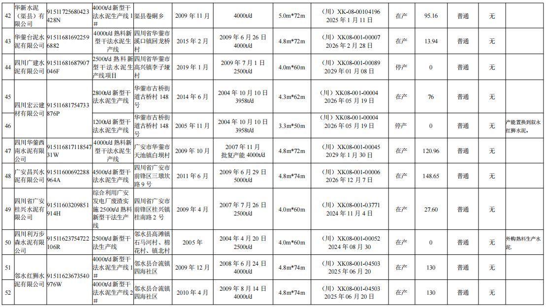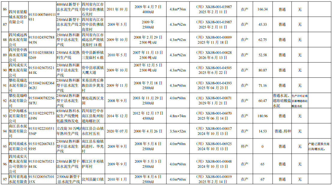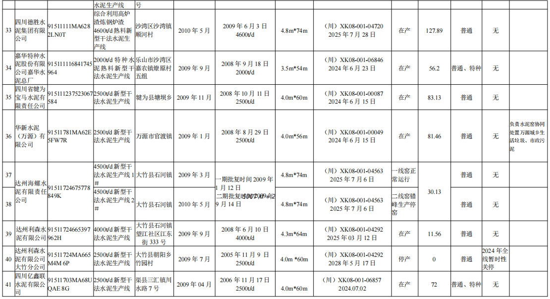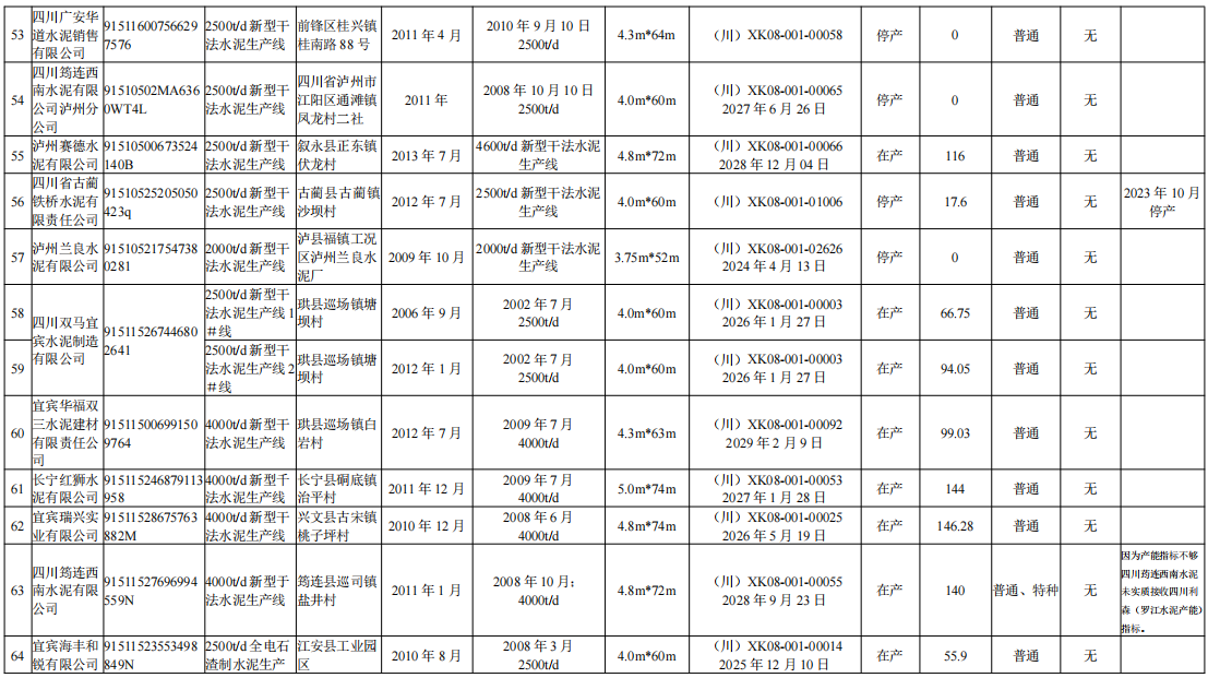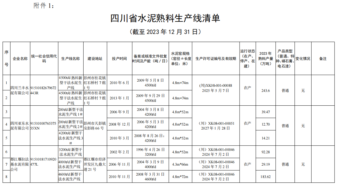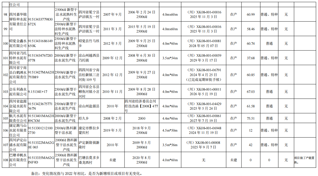 4月9日,四川省經(jīng)信廳發(fā)布熟料生產(chǎn)線清單。截至2023年12月31日,四川省共計(jì)108條水泥熟料生產(chǎn)線,其中,16條停產(chǎn)、1條停窯、1條未建。