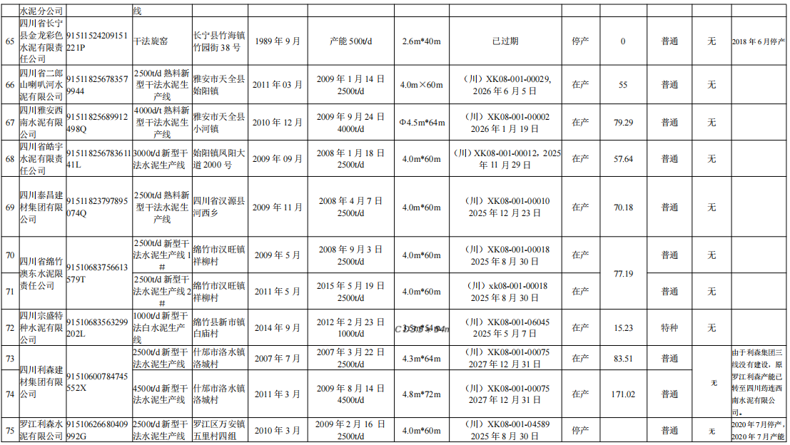 羅江利森水泥有限公司2500t/d新型干法水泥生產(chǎn)線2020年7月停產(chǎn),2020年7月產(chǎn)能已置換至四川利森建材集團(tuán)有限公司