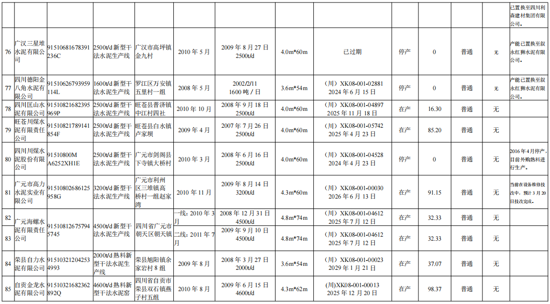 四川德陽金八角水泥有限公司1600t/d新型干法水泥生產(chǎn)線產(chǎn)能已置換至敘永紅獅水泥有限公司