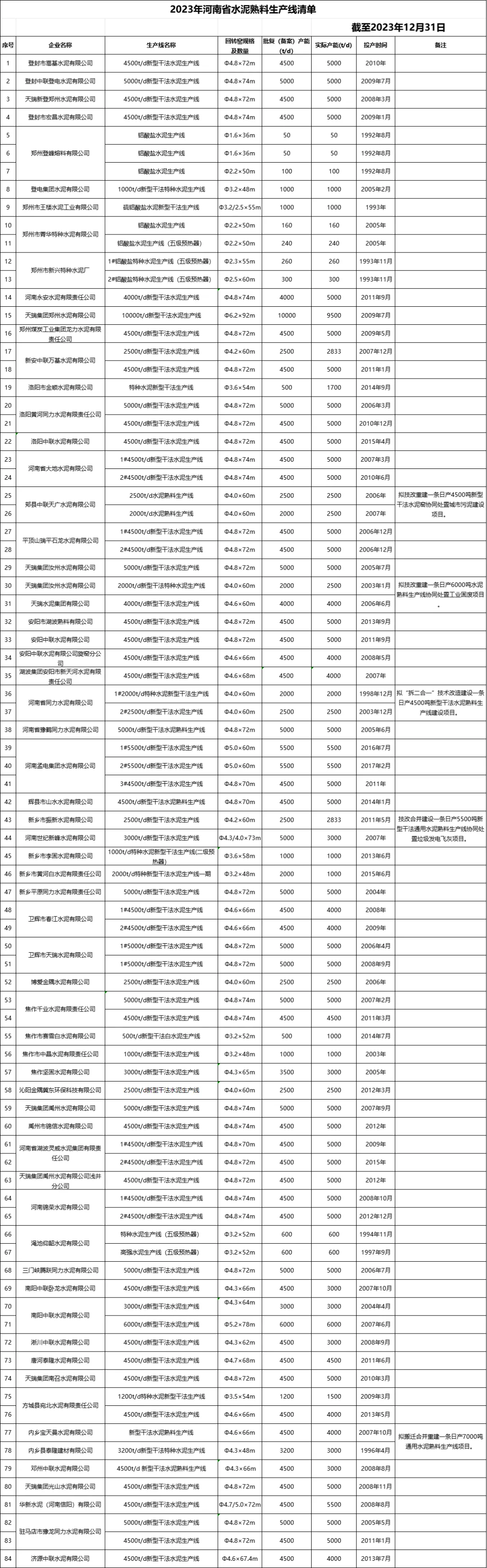 4月8日,河南省工業(yè)和信息化廳公示了《2023年河南省水泥熟料生產(chǎn)線清單》。截至2023年12月31日,河南省共計(jì)84條水泥熟料生產(chǎn)線,其中,共有10條生產(chǎn)線將“技改重建、拆二合一”。