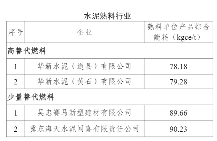 少量替代燃料,吳忠賽馬新型建材有限公司熟料單位產(chǎn)品綜合能耗為89.66kgce/t;冀東海天水泥聞喜有限責(zé)任公司熟料單位產(chǎn)品綜合能耗為90.23kgce/t。