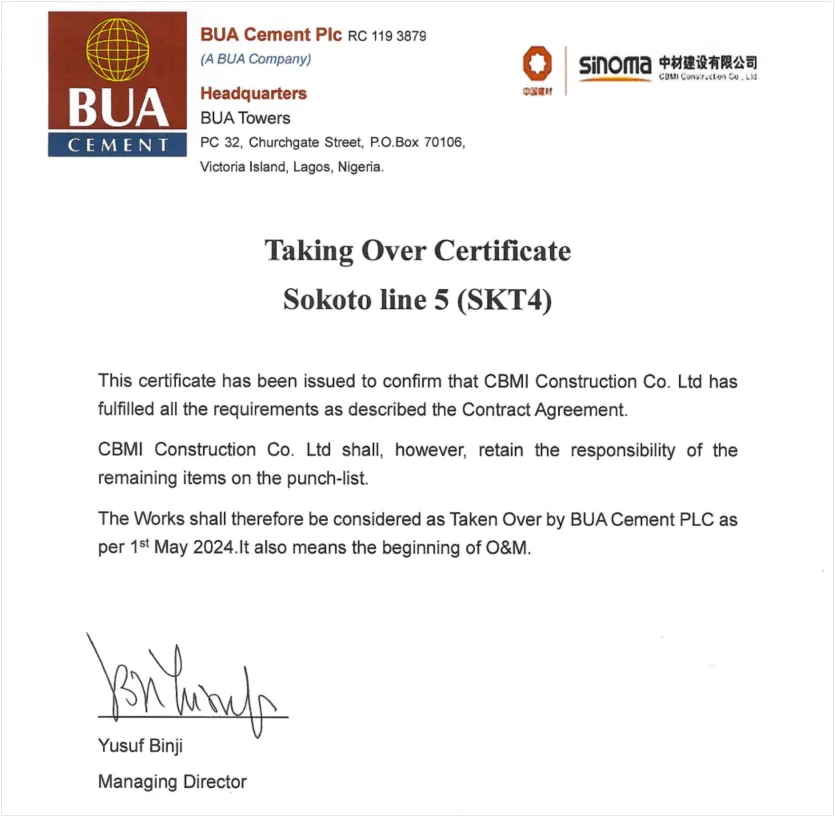 2024年5月1日,尼日利亞SOKOTO4項目6000TPD熟料水泥生產(chǎn)線成功獲得業(yè)主BUA水泥集團(tuán)簽發(fā)的TOC證書。TOC證書的簽發(fā)標(biāo)志著SOKOTO4項目EPC總承包成功履約,項目執(zhí)行畫上圓滿句號,生產(chǎn)線正式移交業(yè)主并轉(zhuǎn)入生產(chǎn)運營。