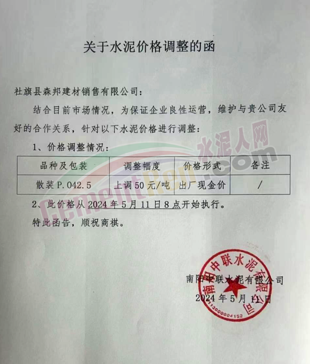 河南天瑞滎陽分公司通知,自5月11日9時30分起,P.O42.5水泥上調(diào)30元/噸,當(dāng)天中午M32.5水泥上調(diào)20元/噸。價格調(diào)整后M32.5包裝水泥出廠價250元/噸,P.O42.5散裝水泥出廠價295元/噸。南陽中聯(lián)水泥通知5月11日起水泥價格上調(diào)50元/噸。