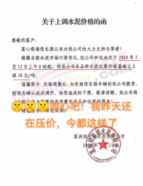 湖北葛洲壩宜城水泥通知,自5月12日上午8時起,水泥價格上調(diào)30元/噸。一經(jīng)銷商表示,前一天還在壓價,后一天就這樣了。