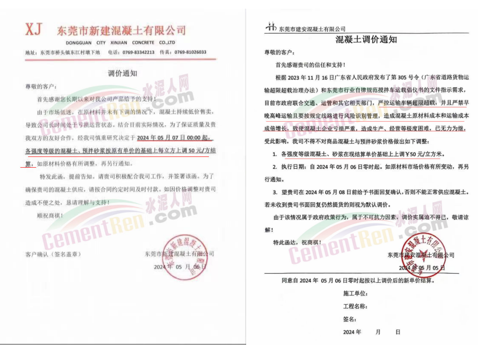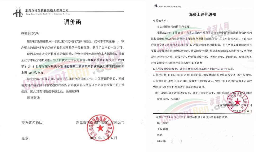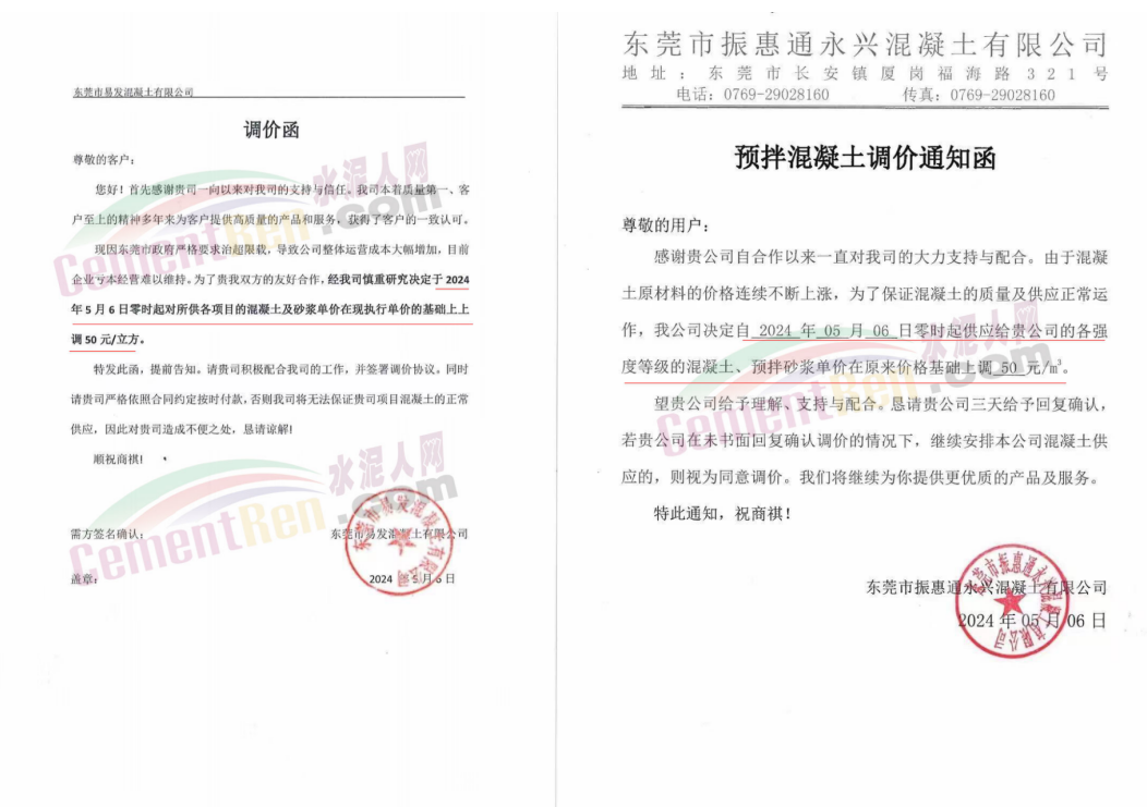 東莞市建安混凝土有限公司通知,目前市政府聯(lián)合交通、運管和其他相關(guān)部門,嚴(yán)控運輸車輛超限超載,并且嚴(yán)禁早晚高峰運輸且要按規(guī)定線路進(jìn)行風(fēng)險識別管理,造成混凝土原材料成本和運輸成本成倍增長,致使混凝土企業(yè)虧損嚴(yán)重,造成生產(chǎn)、經(jīng)營等極度困難,已無力為繼。受此影響,公司對各強(qiáng)度等級混凝土、砂漿在現(xiàn)結(jié)算價格基礎(chǔ)上上調(diào)50元/立方米。