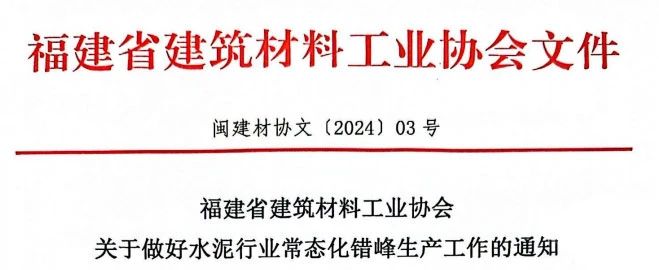 日前,福建省建筑材料工業(yè)協(xié)會發(fā)布《關(guān)于做好水泥行業(yè)常態(tài)化錯峰生產(chǎn)工作的通知》要求,福建省內(nèi)所有水泥熟料生產(chǎn)線(不論目標(biāo)市場為何地)均須參與錯峰生產(chǎn)。