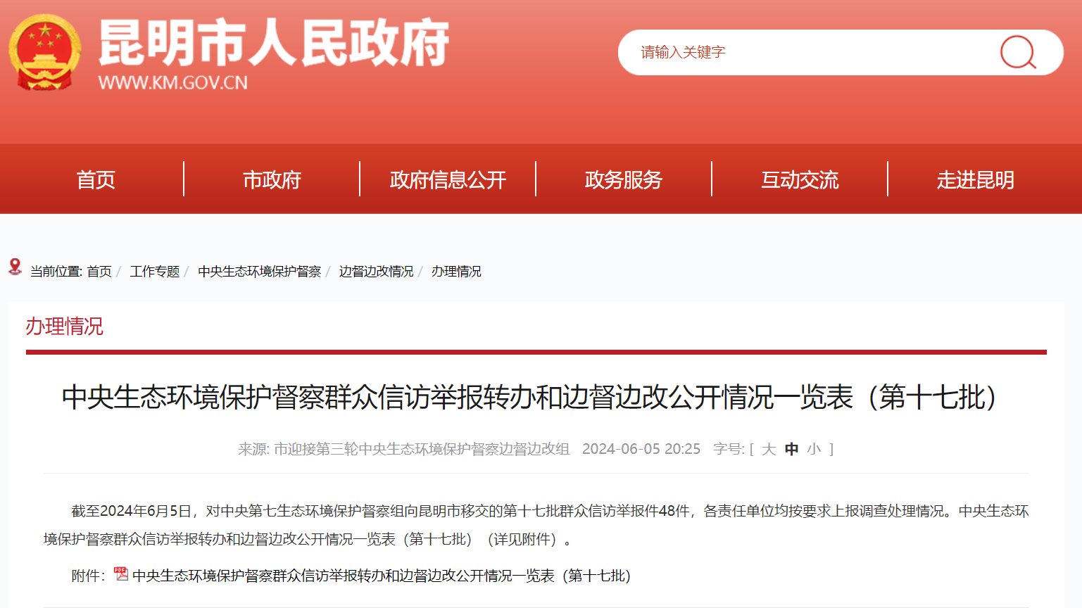 昆明市政府官網2024年6月5日消息:截至2024年6月5日,對中央第七生態(tài)環(huán)境保護督察組向昆明市移交的第十七批群眾信訪舉報件48件,各責任單位均按要求上報調查處理情況。以下為中央生態(tài)環(huán)境保護督察群眾信訪舉報轉辦和邊督邊改公開情況一覽表(第十七批)。
