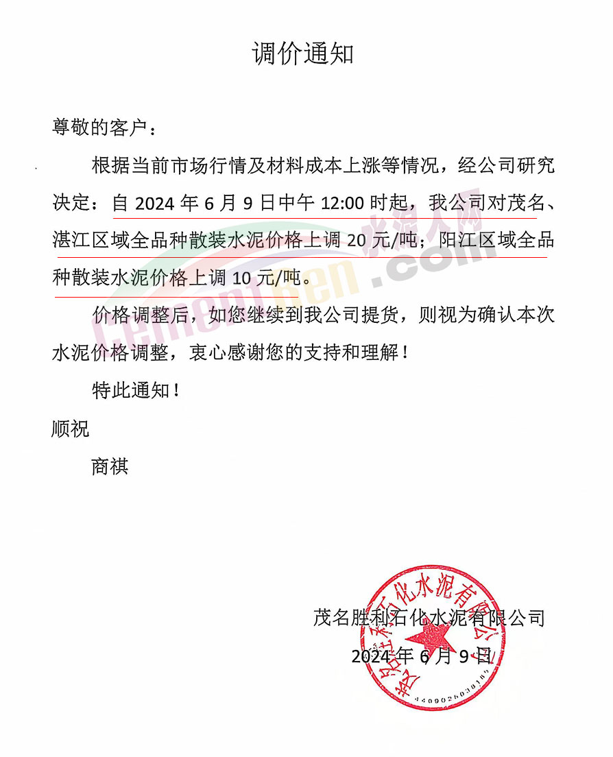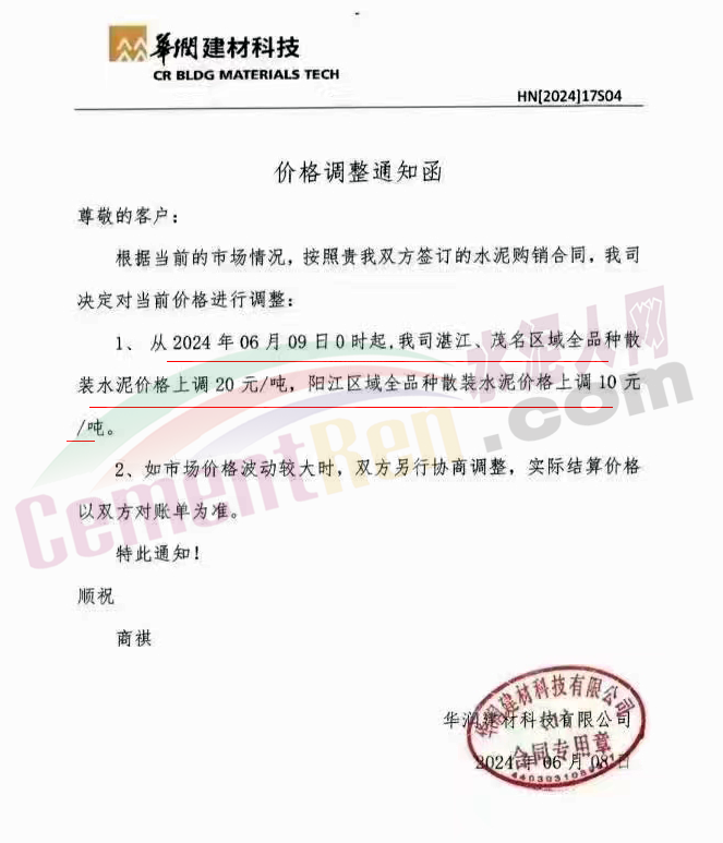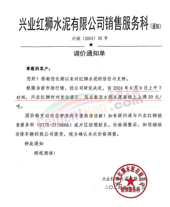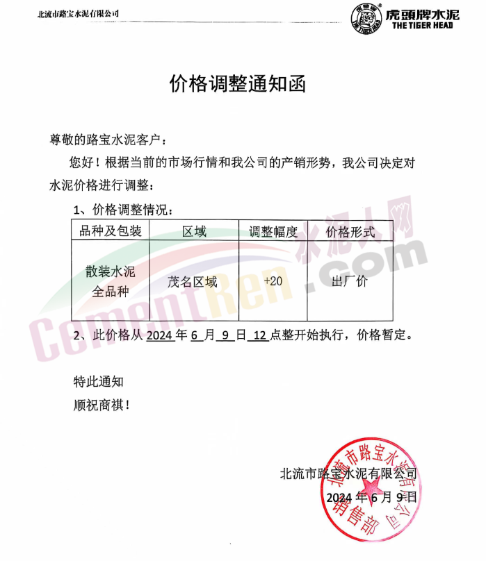 日前,華南主要品牌企業(yè)華潤建材科技有限公司通知,從2024年6月9日0時起,湛江、茂名區(qū)域全品種散裝水泥價格上調(diào)20元/噸,陽江區(qū)域全品種散裝水泥價格上調(diào)10元/噸。這是新國標(biāo)實施后廣東第一波上漲,同期,廣西區(qū)域興業(yè)紅獅、北流寶路等多家品牌企業(yè)通知上調(diào)粵西區(qū)域水泥報價。