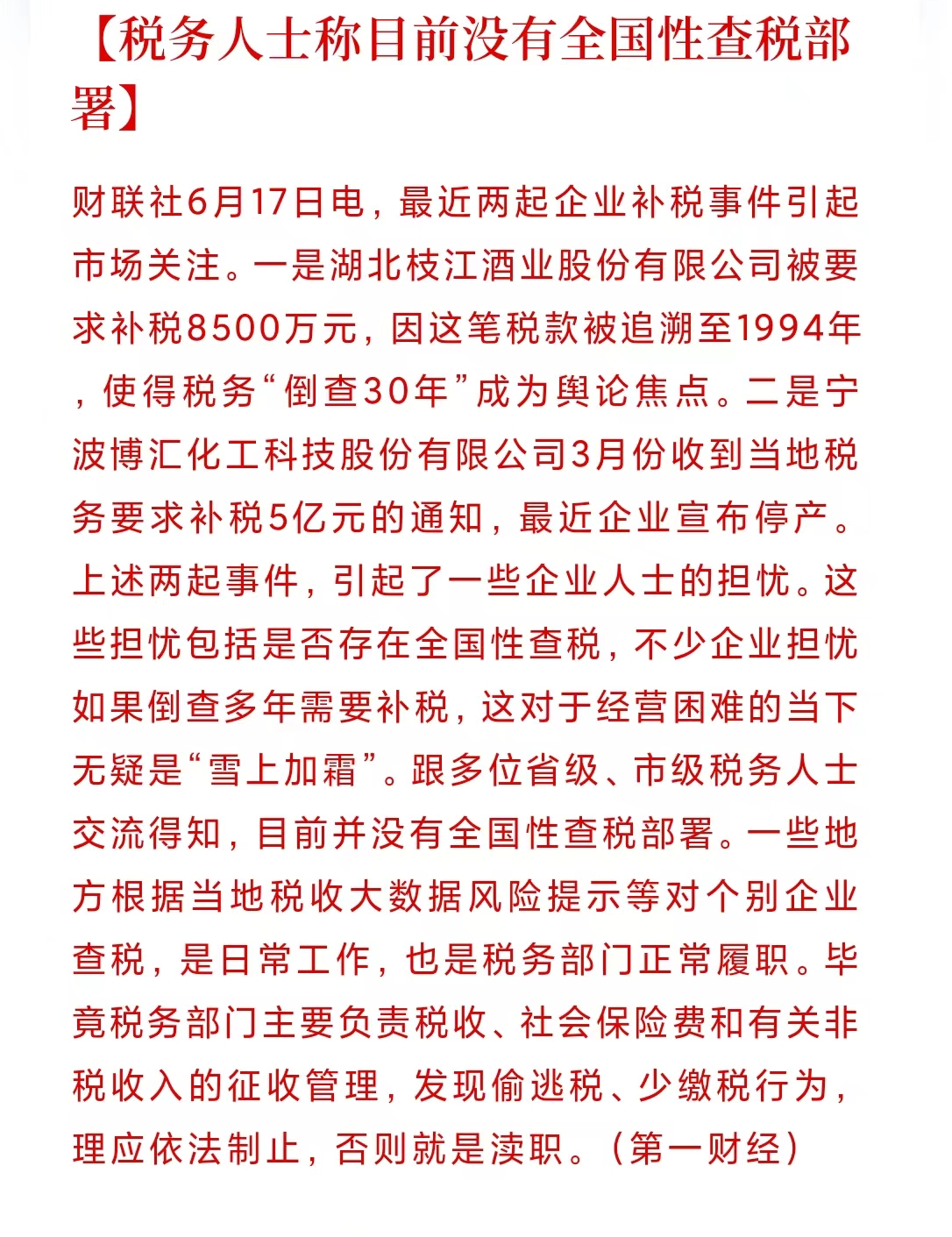 湖北稅務(wù)局也對此次稽查做出回應(yīng),不存在“倒查30年”,此次對枝江酒業(yè)下發(fā)《稅務(wù)事項(xiàng)通知書》,系審計(jì)部門發(fā)現(xiàn)枝江酒業(yè)前期有稅款欠繳,稅務(wù)部門按照程序正常追繳,審計(jì)追欠,沒啥特殊的原因和背景,不要誤讀。