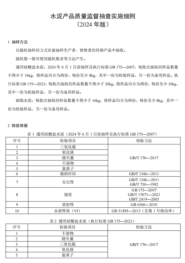 日前,國家市場監(jiān)督管理總局發(fā)布服務(wù)器等147種產(chǎn)品質(zhì)量監(jiān)督抽查實(shí)施細(xì)則的公告,其中包括《水泥產(chǎn)品質(zhì)量監(jiān)督抽查實(shí)施細(xì)則(2024年版)》。