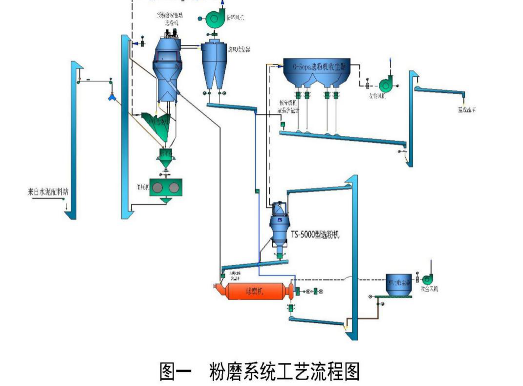 隨著節(jié)能減碳與水泥新標(biāo)準(zhǔn)實(shí)施的臨近,市場對水泥裝備及水泥產(chǎn)品提出了更高的要求,選粉機(jī)作為節(jié)能減碳的重要裝備以及決定產(chǎn)品質(zhì)量的最終裝備,顯得尤為重要。為了適應(yīng)新的要求,蘇州天山水泥有限公司會同江蘇吉能達(dá)公司運(yùn)用多級氣流分散分級理論,對水泥粉磨系統(tǒng)(工藝流程見圖一)磨尾使用的TS-5000型選粉機(jī)進(jìn)行了設(shè)計(jì)改進(jìn),分別于2021年和2024年初結(jié)合大修做了實(shí)施。新設(shè)計(jì)改進(jìn)的選粉機(jī)選粉效率提高了10%;系統(tǒng)產(chǎn)量提高了15噸/時(shí);水泥產(chǎn)品粒度分布更符合市場及水泥新標(biāo)準(zhǔn)的要求。