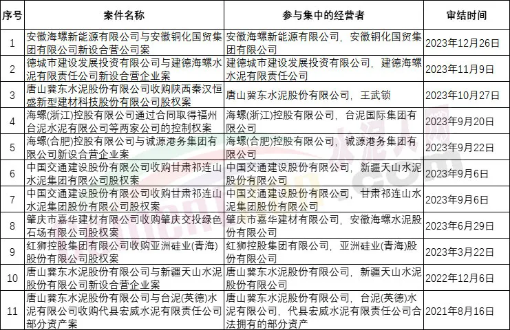2023年市場監(jiān)管總局公布的《無條件批準經(jīng)營者集中案》中11例,涉及水泥行業(yè)海螺水泥、冀東水泥、臺泥水泥、紅獅水泥等多家頭部企業(yè)。