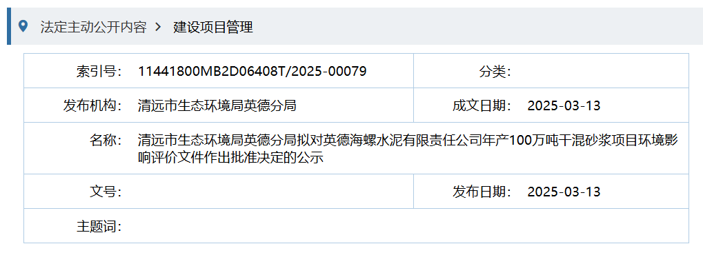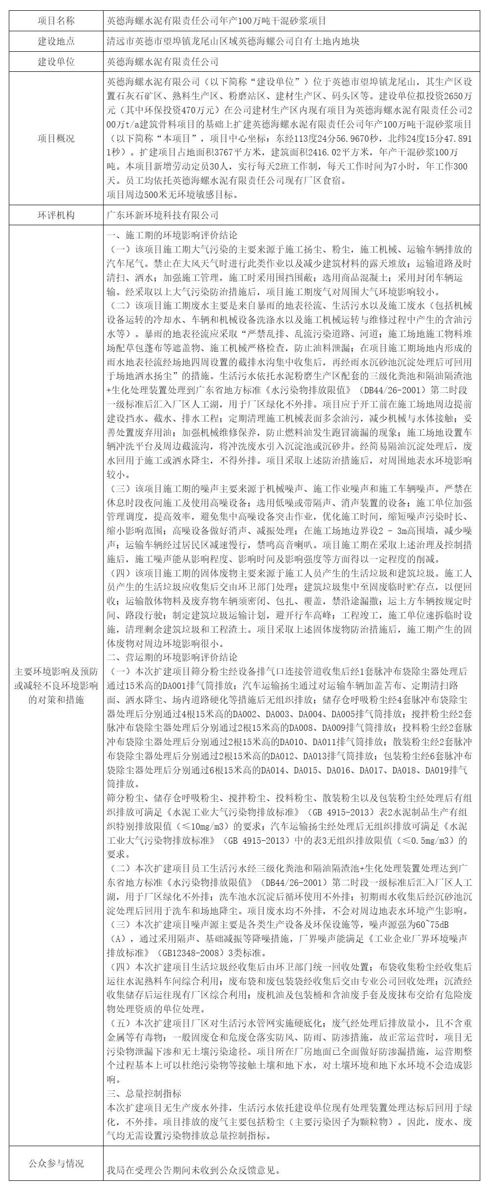 3月13日,清遠(yuǎn)市生態(tài)環(huán)境局英德分局?jǐn)M對(duì)英德海螺水泥有限責(zé)任公司年產(chǎn)100萬(wàn)噸干混砂漿項(xiàng)目環(huán)境影響評(píng)價(jià)文件作出批準(zhǔn)決定的公示。