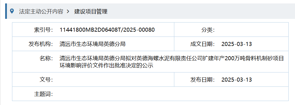 同日發(fā)布擬對(duì)英德海螺水泥有限責(zé)任公司擴(kuò)建年產(chǎn)200萬(wàn)噸骨料機(jī)制砂項(xiàng)目環(huán)境影響評(píng)價(jià)文件作出批準(zhǔn)決定的公示稱,根據(jù)英德海螺水泥有限責(zé)任公司擴(kuò)建年產(chǎn)200萬(wàn)噸骨料機(jī)制砂項(xiàng)目環(huán)境影響評(píng)價(jià)文件、技術(shù)評(píng)估報(bào)告等,按照建設(shè)項(xiàng)目環(huán)境影響評(píng)價(jià)審批程序的有關(guān)規(guī)定,審批機(jī)構(gòu)擬對(duì)該項(xiàng)目環(huán)境影響評(píng)價(jià)文件作出批準(zhǔn)決定。為體現(xiàn)公開(kāi)、公正的原則,強(qiáng)化公眾參與,現(xiàn)予公示。