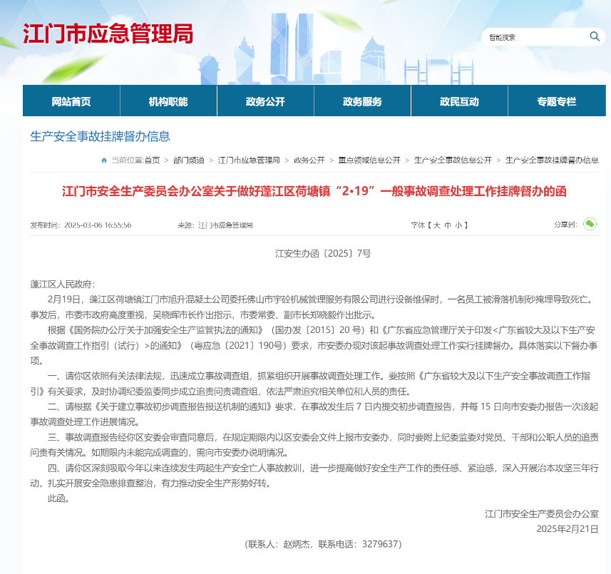 近日,江門市安全生產(chǎn)委員會辦公室發(fā)布消息,2月19日,蓬江區(qū)荷塘鎮(zhèn)江門市旭升混凝土公司委托佛山市宇砼機械管理服務(wù)有限公司進行設(shè)備維保時,一名員工被滑落機制砂掩埋導致死亡。根據(jù)《國務(wù)院辦公廳關(guān)于加強安全生產(chǎn)監(jiān)管執(zhí)法的通知》(國辦發(fā)〔2015〕20號)和《廣東省應(yīng)急管理廳關(guān)于印發(fā)的通知》(粵應(yīng)急〔2021〕190號)要求,市安委辦對該起事故調(diào)查處理工作實行掛牌督辦。