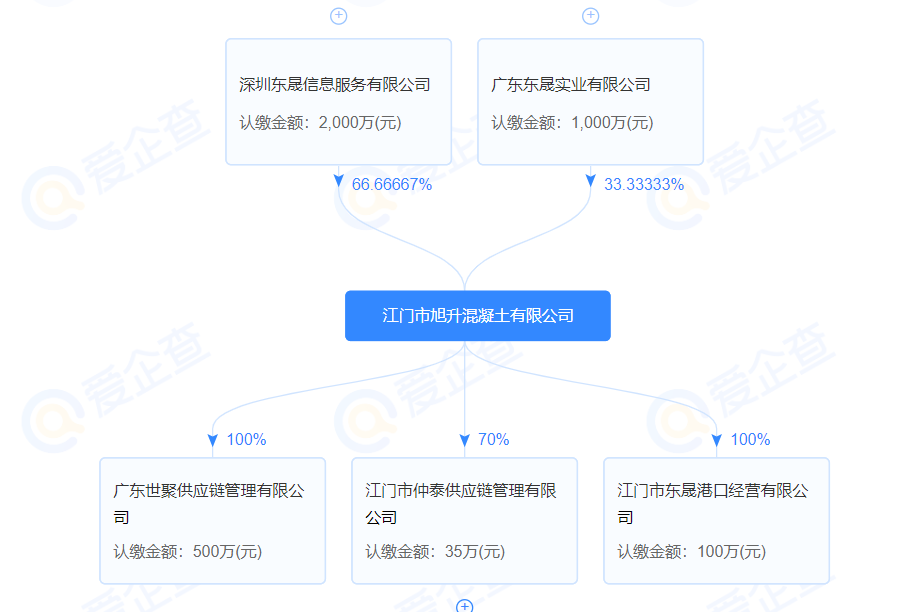 企業(yè)股權(quán)穿透圖顯示,江門市旭升混凝土公司為深圳東晟信息服務(wù)有限公司和廣東東晟實業(yè)有限公司合資企業(yè)。深圳東晟信息服務(wù)有限公司為控股股東,持股比例66.67%,第二大股東廣東東晟實業(yè)有限公司,持股33.33%。
