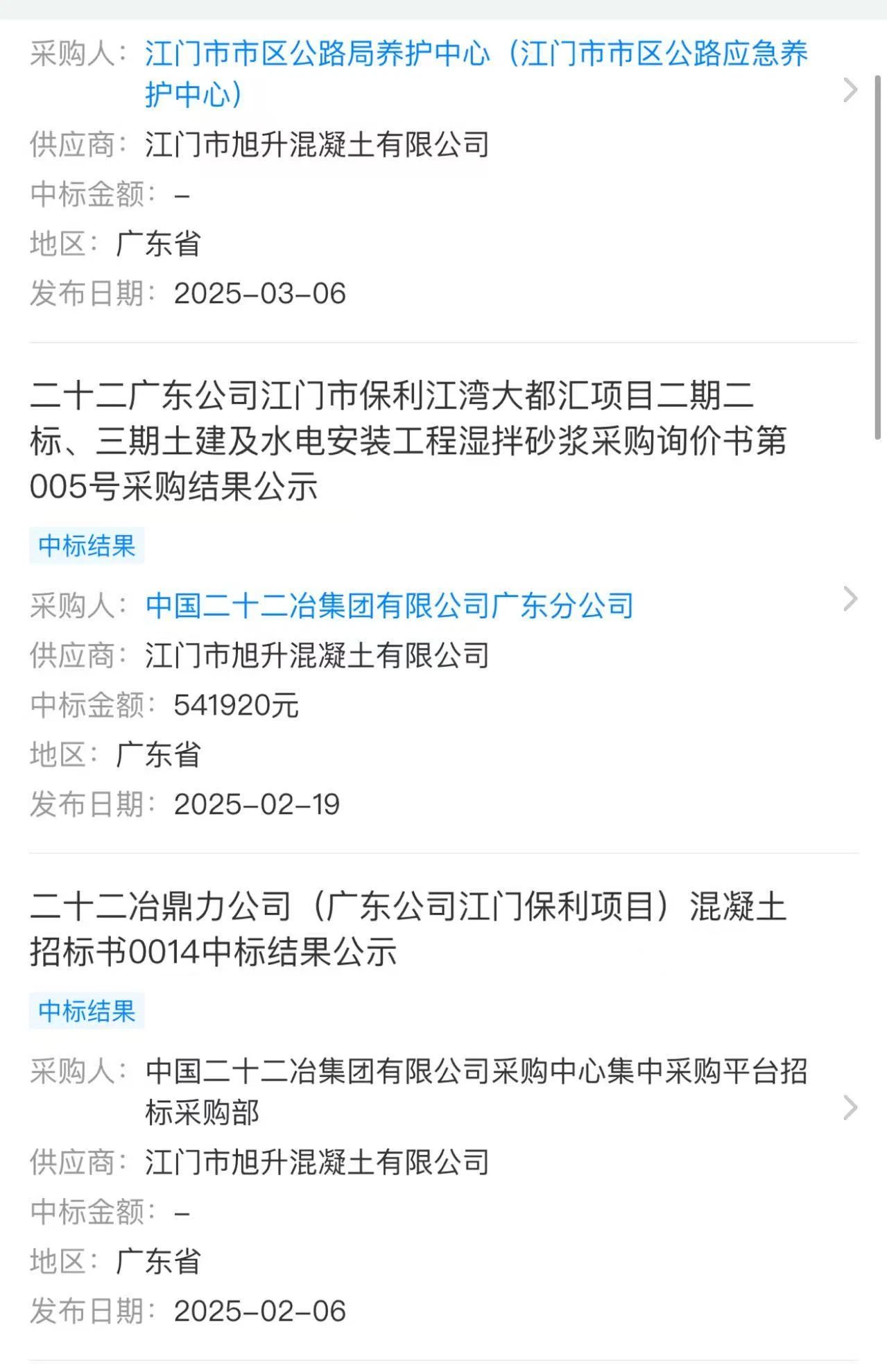 江門市旭升混凝土公司近期曾中標中國二十二冶集團有限公司旗下,廣東公司江門市保利江灣大都匯項目二期二標、三期土建及水電安裝工程濕拌砂漿供應(yīng)和二十二冶鼎力公司廣東公司江門保利項目混凝土供應(yīng)。