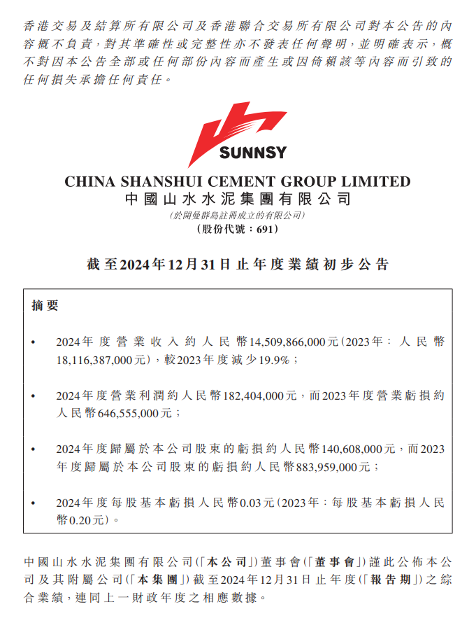 山水水泥2024年凈虧損約1.41億元,同比收窄84.09%
