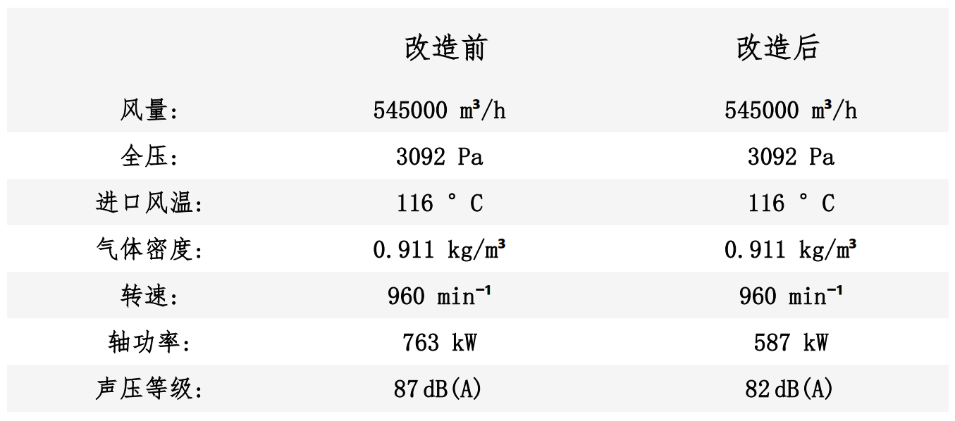 在項目低投入下,客戶成功完成了風機的改造升級,能耗大幅降低23%,噪音降低5.8%,實現(xiàn)了低成本,高效益的既定改造目標。風機改造前后的參數(shù)如下:
