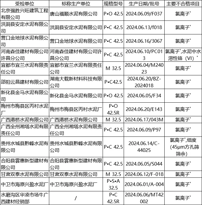 日前,國家市場監(jiān)管總局發(fā)布《2024年電子產(chǎn)品用鋰離子電池和電池組等27種產(chǎn)品質(zhì)量國家監(jiān)督抽查情況通報(bào)》稱,共抽查檢驗(yàn)7841家生產(chǎn)單位、2937家銷售單位的8218批次產(chǎn)品,發(fā)現(xiàn)不合格產(chǎn)品740批次。其中,水泥產(chǎn)品共抽查880批次,在四川、山東、遼寧、黑龍江、河北、湖南等23個(gè)省份106家銷售單位抽查115批次產(chǎn)品,在山東、河北、四川、遼寧、山西、廣東等30個(gè)省份765家生產(chǎn)單位抽查765批次產(chǎn)品,抽查共發(fā)現(xiàn)29批次產(chǎn)品不合格。其中包含16批次產(chǎn)品氯離子不合格、4批次產(chǎn)品水泥中水溶性鉻(Ⅵ)不合格、2批次產(chǎn)品強(qiáng)度不合格,均為安全項(xiàng)目;5批次產(chǎn)品細(xì)度不合格、3批次產(chǎn)品燒失量不合格、1批次產(chǎn)品三氧化硫不合格。