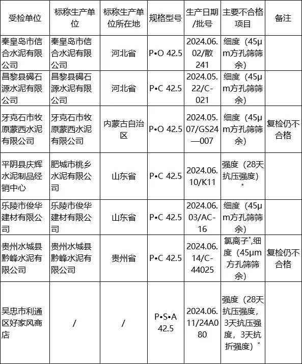 牙克石市牧原蒙西水泥有限公司、營口金地球水泥有限公司、貴州水城縣黔峰水泥有限公司、中衛(wèi)市海原興盈水泥廠、濟(jì)南市濟(jì)陽區(qū)鴻大建材廠等7個(gè)批次復(fù)檢仍不合格。