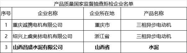 (三)拒檢情況。本次抽查中,重慶誠攜電機(jī)有限公司、紹興上虞奧林電機(jī)有限公司、山西昌盛水泥有限公司違反《產(chǎn)品質(zhì)量法》規(guī)定,無正當(dāng)理由拒絕接受監(jiān)督抽查。