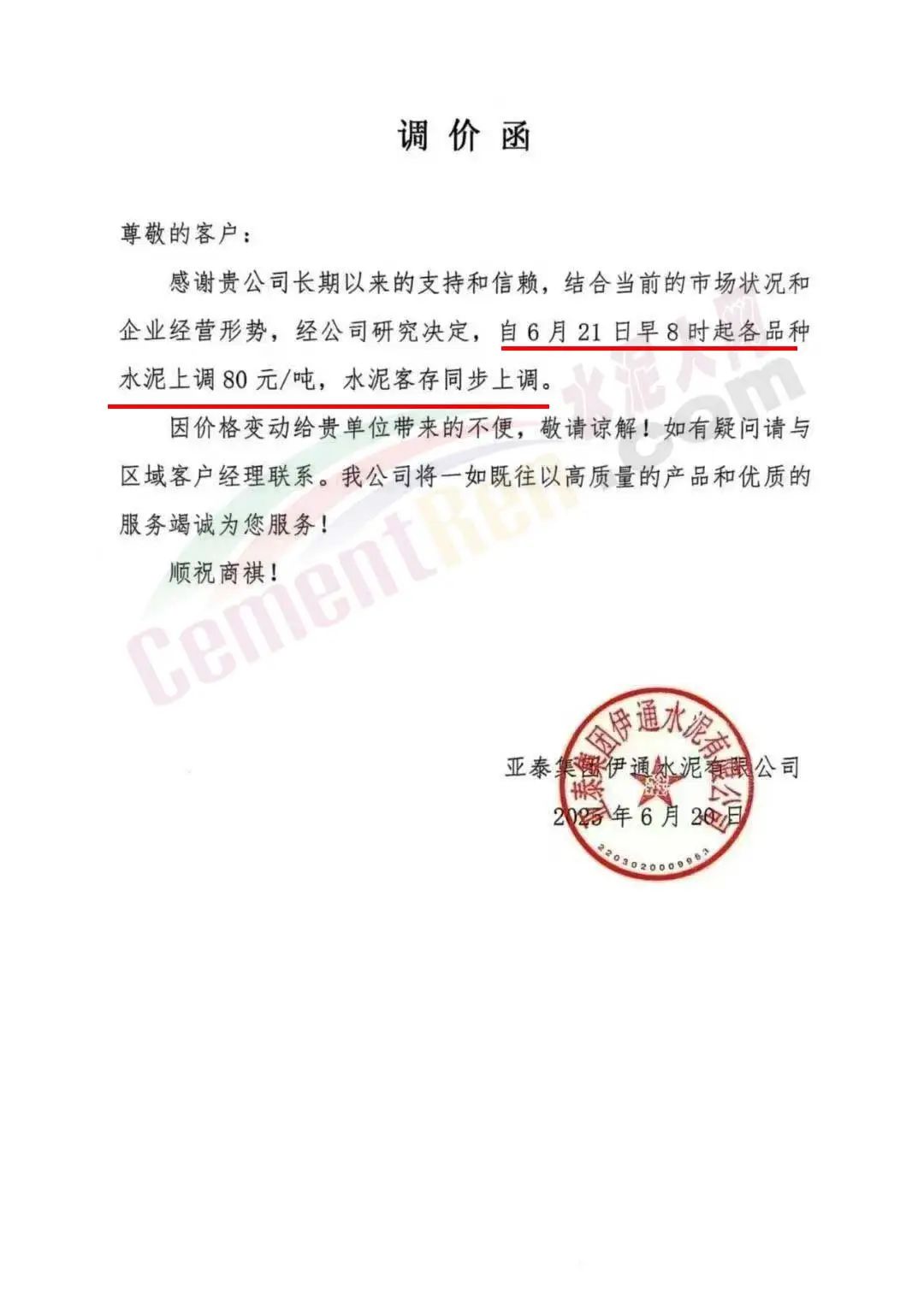 吉林天和水泥通知,自6月21日起,公司出廠的各品種水泥價格在原價基礎(chǔ)上上調(diào)80元/噸,客存同步上漲。