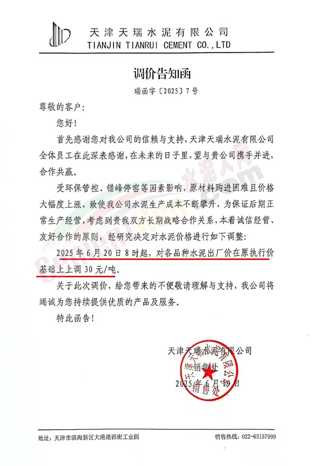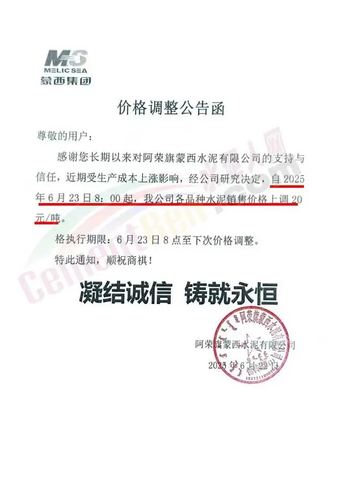 天津天瑞水泥有限公司通知,受環(huán)保管控、錯峰停窯等因素影響,原材料購進困難且價格大幅度上漲,致使公司水泥生產(chǎn)成本不斷攀升,為保證后期正常生產(chǎn)經(jīng)營,經(jīng)研究決定2025年6月20日8時起,對各品種水泥出廠價在原執(zhí)行價基礎(chǔ)上上調(diào)30元/噸。