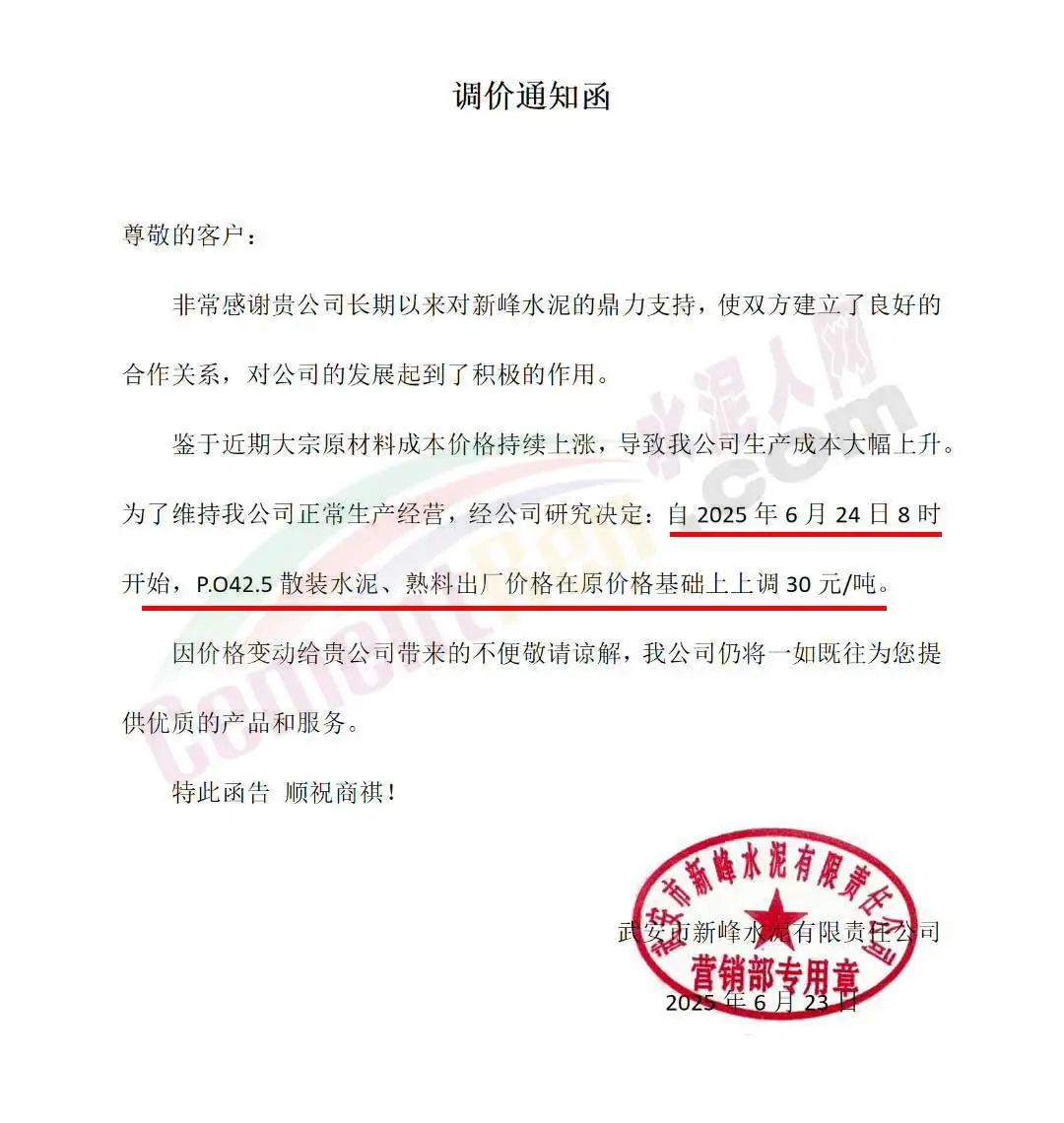 武安市新峰水泥有限責任公司通知,鑒于近期大宗原材料成本價格持續(xù)上漲,導(dǎo)致公司生產(chǎn)成本大幅上升,為了維持公司正常生產(chǎn)經(jīng)營,經(jīng)公司研究決定:自2025年6月24日8時開始,P.O42.5散裝水泥、熟料出廠價格在原價格基礎(chǔ)上上調(diào)30元/噸。