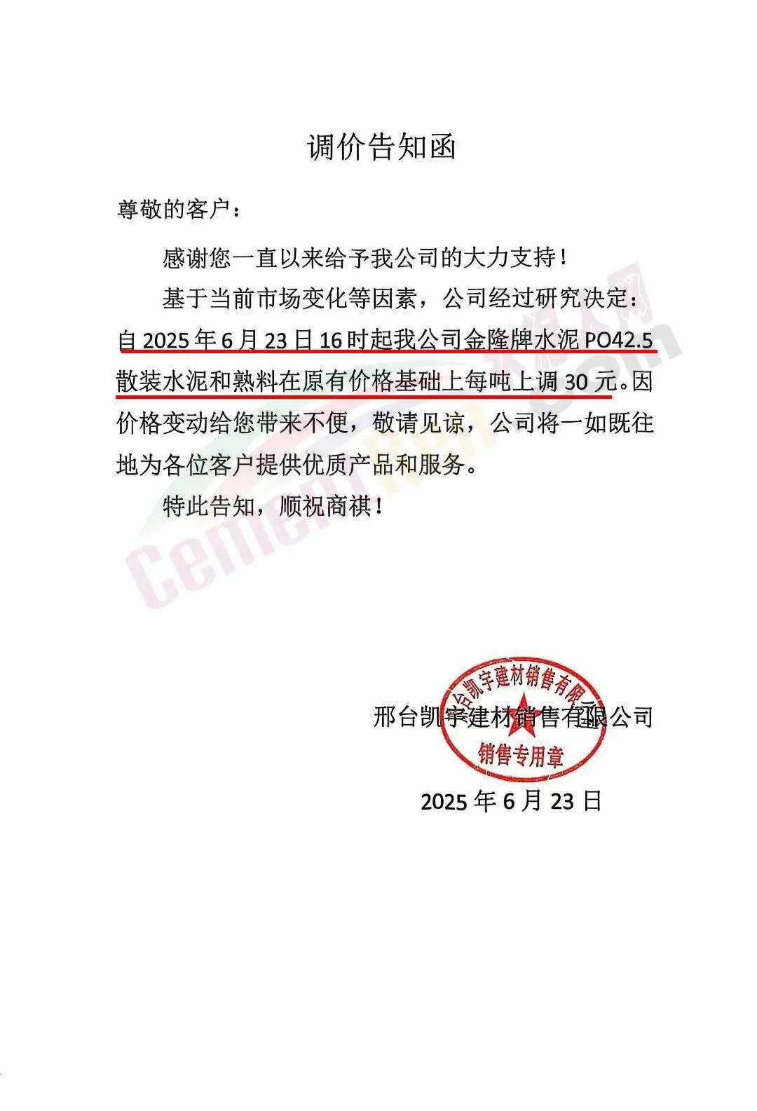 邢臺凱宇建材銷售有限公司通知,基于當前市場變化等因素,公司經(jīng)過研究決定:自2025年6月23日16時起公司金隆牌水泥PO42.5散裝水泥和熟料在原有價格基礎(chǔ)上每噸上調(diào)30元。