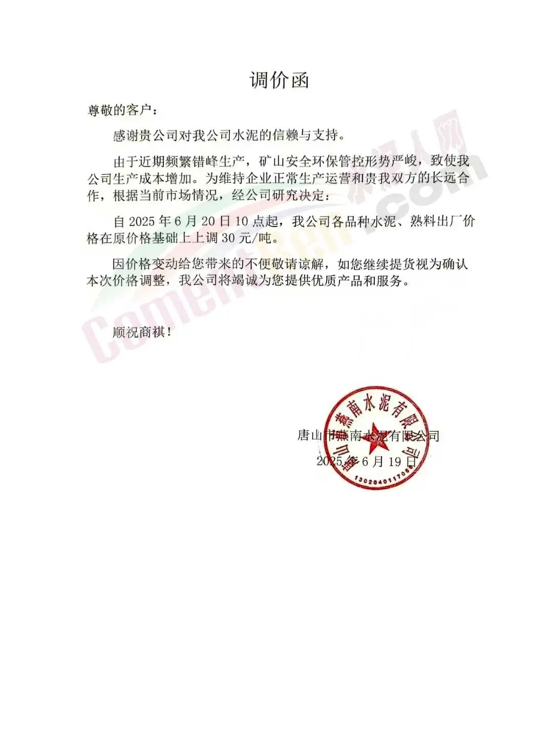 唐山市燕南水泥有限公司通知,由于近期頻繁錯峰生產(chǎn),礦山安全環(huán)保管控形勢嚴峻,致使公司生產(chǎn)成本增加。為維持企業(yè)正常生產(chǎn)運營,根據(jù)當前市場情況,經(jīng)公司研究決定:自2025年6月20日10點起,公司各品種水泥、熟料出廠價格在原價格基礎(chǔ)上上調(diào)30元/噸。