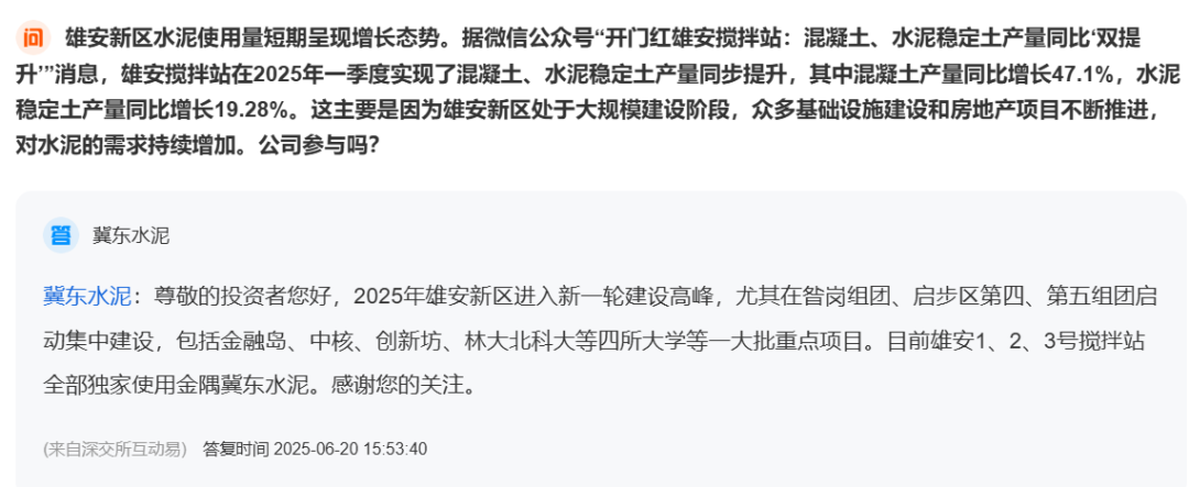 值得關(guān)注的是,近期冀東水泥在上市公司平臺回應(yīng)投資者時表示:”2025年雄安新區(qū)進入新一輪建設(shè)高峰,尤其在昝崗組團、啟步區(qū)第四、第五組團啟動集中建設(shè),包括金融島、中核、創(chuàng)新坊、林大北科大等四所大學(xué)等一大批重點項目。目前雄安1、2、3號攪拌站全部獨家使用金隅冀東水泥。“
