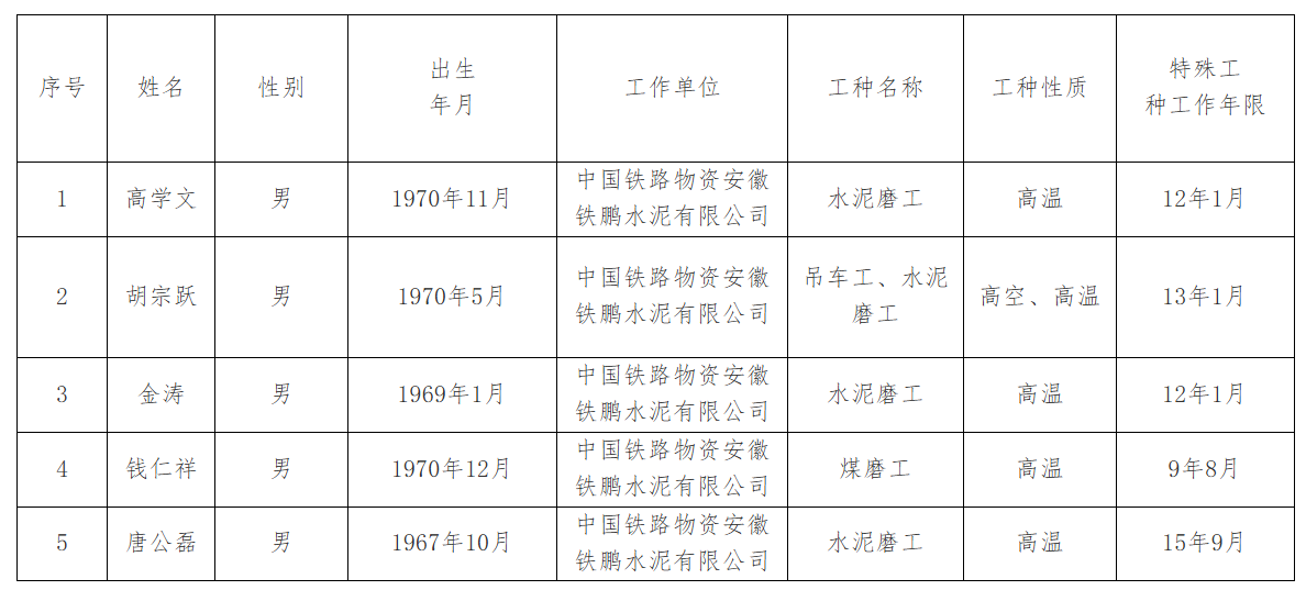 特殊工種提前退休人員公示